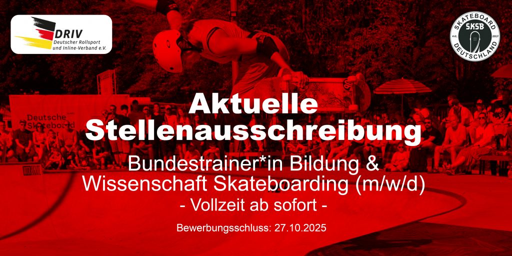 Der Deutsche Rollsport und Inline-Verband (DRIV) sucht zum nächstmöglichen Zeitpunkt einen **Bundestrainerin Bildung & Wissenschaft Skateboarding (m/w/d)** in Vollzeit.